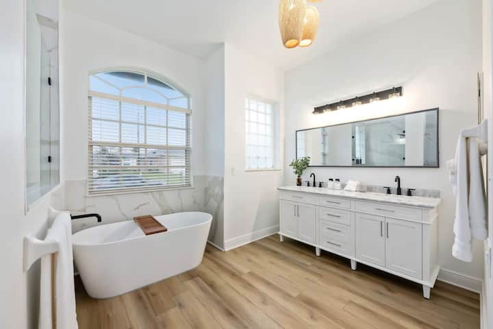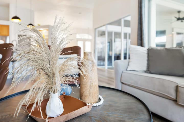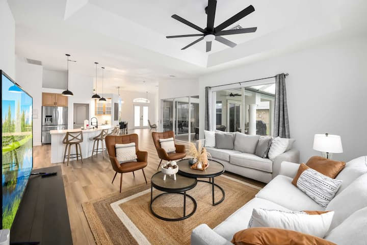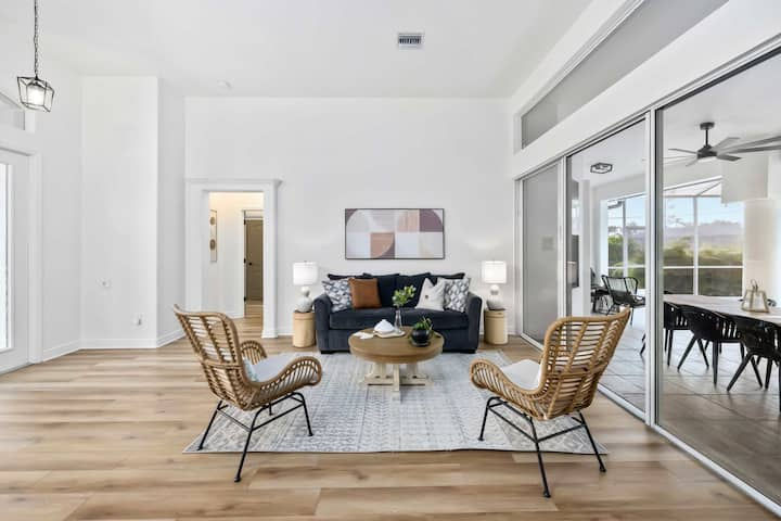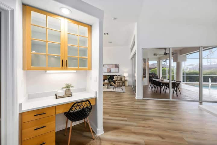 Palmcrest Villa is a modern 3-bed, 3-bath pool home in SW Cape Coral with over 2,300 sq ft of updated luxury. Enjoy quartz counters, high ceilings, en-suite bedrooms, and massive pocket sliders that open to a heated pool for true indoor/outdoor living. Minutes to Cape Harbour, Downtown Cape Coral, beaches, parks, dining, and all the best of SWFL.